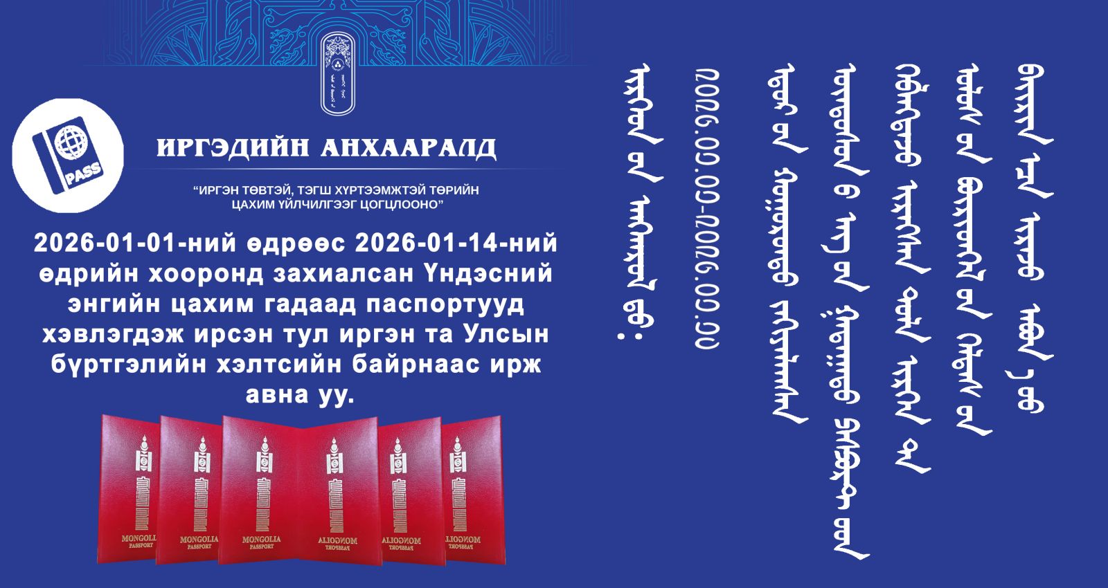 2026-01-01-ний өдрөөс 2026-01-14-ний өдрийн хооронд захиалсан Үндэсний энгийн цахим гадаад паспортууд хэвлэгдэж ирсэн тул иргэн та Улсын бүртгэлийн хэлтсийн байрнаас ирж авна уу.
