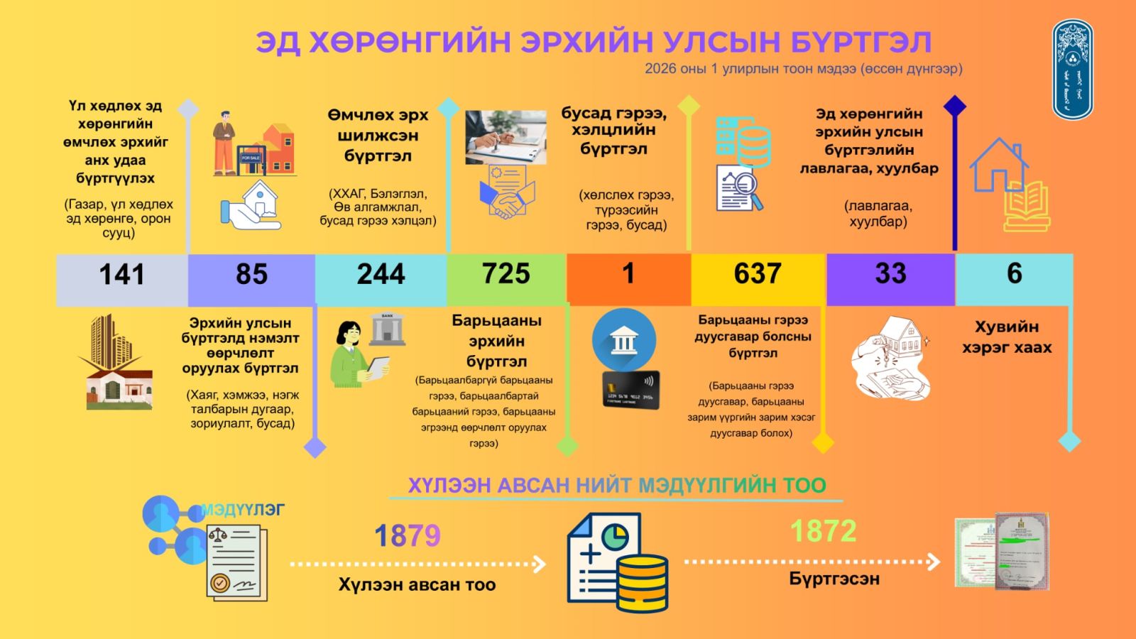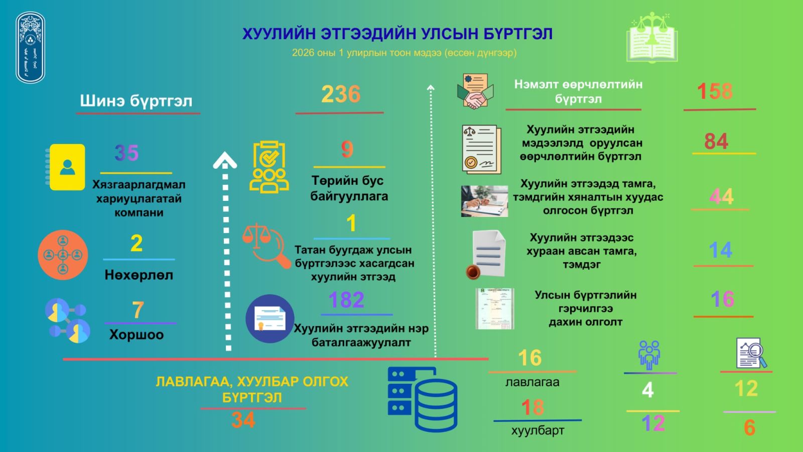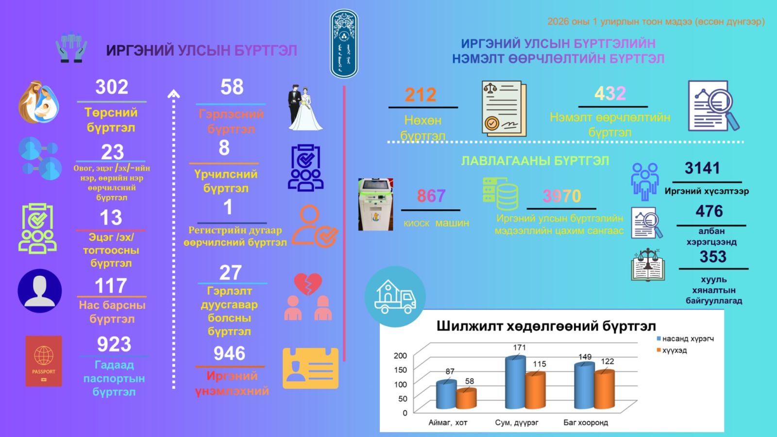 Баянхонгор аймгийн Улсын бүртгэлийн хэлтэс нь 2026 оны 1 дүгээр улирлын улсын бүртгэлийн үйл ажиллагааны тоон мэдээг нэгтгэн танилцуулж байна. Тус хугацаанд иргэний улсын бүртгэлийн 7439, хуулийн этгээдийн улсын бүртгэлийн 428, эд хөрөнгийн эрхийн улсын бүртгэлийн 1872 үйлчилгээ үзүүлсэн байна.