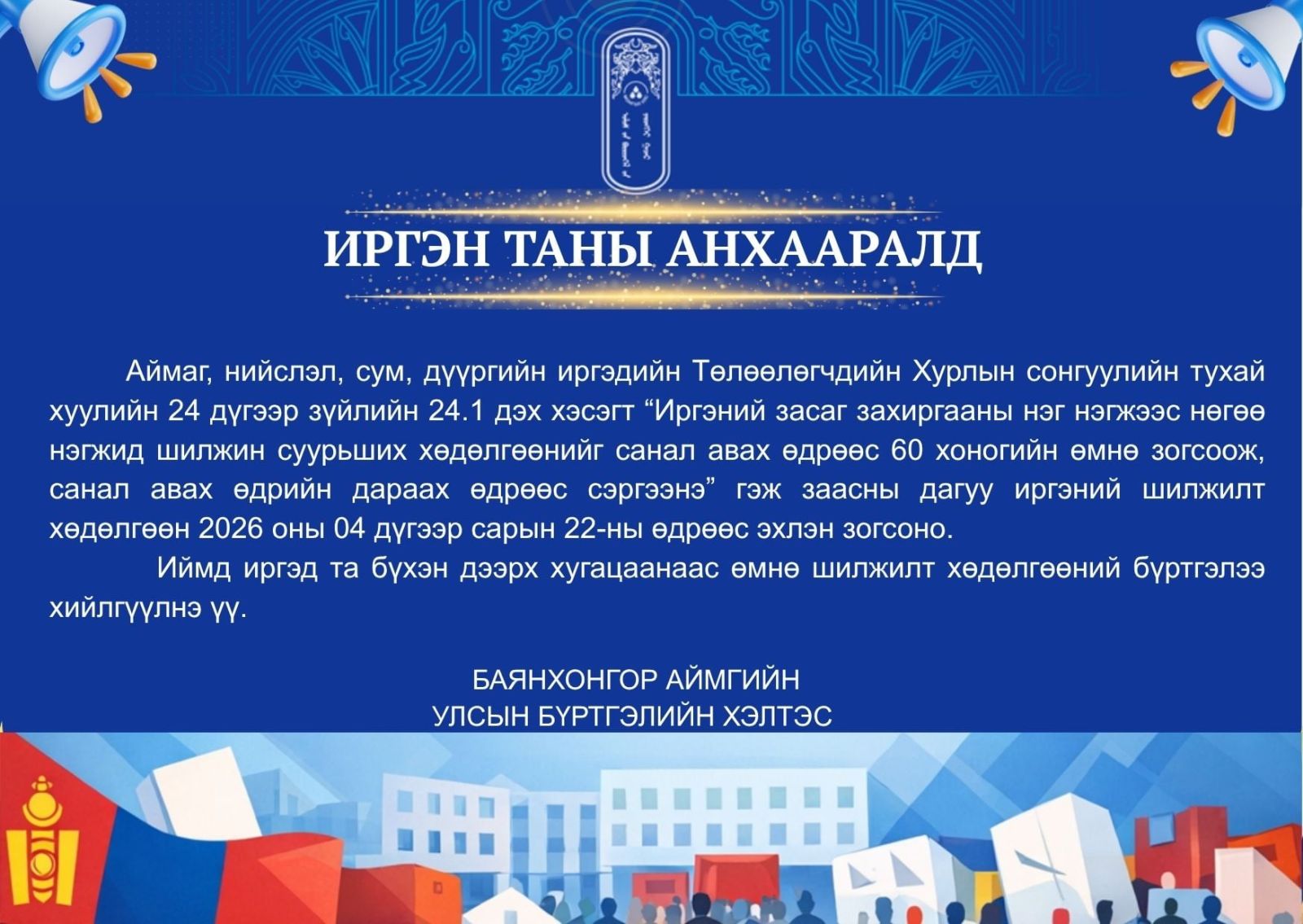 Аймаг, нийслэл, сум, дүүргийн иргэдийн Төлөөлөгчдийн Хурлын сонгуулийн тухай хуулийн 9 дүгээр зүйлийн 9.8, 9.9 дэх заалтуудын дагуу 16 аймгийн 43 сумын 73 сонгуулийн хэсэгт нөхөн сонгууль товлон зарлагдаж, 2026 оны 06 дугаар сарын 21-ний өдрийн Ням гарагт зохион байгуулагдах бөгөөд Баянхонгор аймгийн тухайд Галуут сумын Хайрхан 1 багт нөхөн сонгууль зохион байгуулагдахаар боллоо. Иймээс иргэд та бүхэн Баянхонгор аймгийн Галуут сумын Хайрхан 1 дүгээр багт шилжин суурьших хөдөлгөөн (шилжин ирэх, явах)-ийг заасан хугацаандаа багтаан хийлгүүлнэ үү.